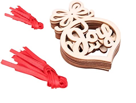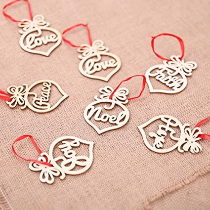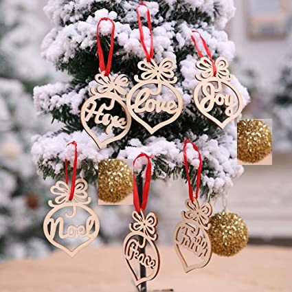 6pcs Wooden Christmas Tree Decorations Ornaments Hanging Wood Peace Faith Hope Love Noel Joy Shapes Cutout 7x10cm.