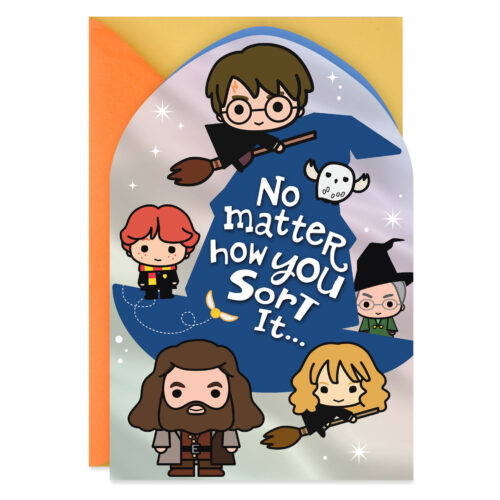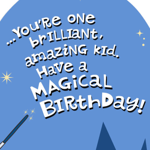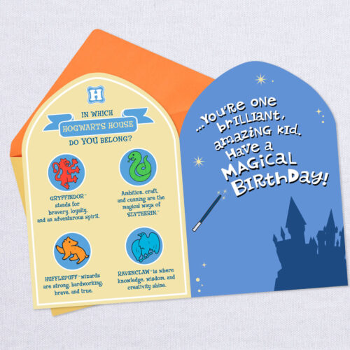 Inside Message: …you’re one brilliant, amazing kid. Have a magical birthday! In which Hogwarts house do you belong? Gryffindor stands for bravery, loyalty, and an adventurous spirit. Ambition, craft, and cunning are the magical ways of Slytherin. Hufflepuff wizards are strong, hardworking, brave, and true. Ravenclaw is where knowledge, wisdom, and creativity shine.