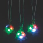 Each 2″ charm hangs on a 24″ cord with breakaway clasp. Plastic. Batteries included