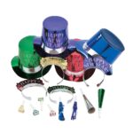 9″ paper cone hats, 5″ x 51/2″ paper tiaras, 8″ paper horns, 7″ plastic with foil squawkers and 14″ diam.