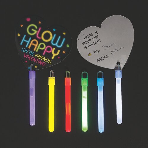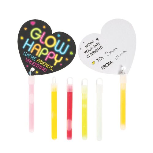 The heart-shaped glow valentine cards printed with “Glow Happy” and features space to attach the included glow sticks