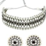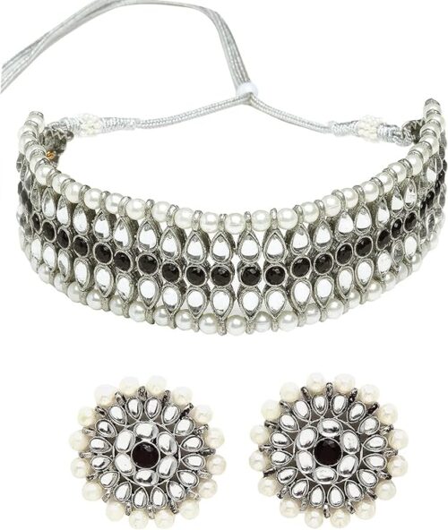- Handcrafted Oxidised Silver Black Kundan and Pearl Studded Choker Necklace Set. It is a High-Quality Oxidised Silver Jewellery Embellished with Kundan. Perfect for Weddings, Party, Festivals, Traditional Occasions.