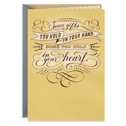 Thank-you greeting card features a heartfelt message in elegant foil script on a shimmery gold background. Blank inside for your personal message of appreciation.