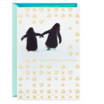 Anniversary card for couple features penguins holding flippers in the snow. A pattern of hearts and Xs catches the eye with embossing and silver and gold foil accents.