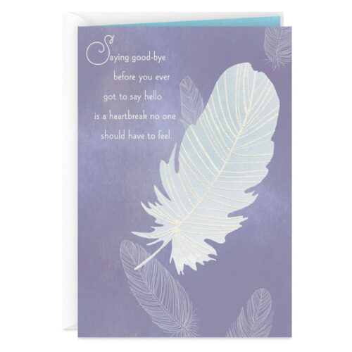 Sympathy greeting card for the loss of their baby features an illustration of softly falling feathers with embossed silver foil and metallic ink accents.