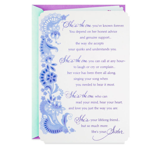 Front Message: She’s the one you’ve known forever. You depend on her honest advice and genuine support… the way she accepts your quirks and understands you. She’s the one you can call at any hour— to laugh or cry or complain… her voice has been there all along, singing your song when you needed to hear it most. She’s the one who can read your mind, hear your heart, and love you just the way you are. She’s your lifelong friend… but so much more. She’s your sister.