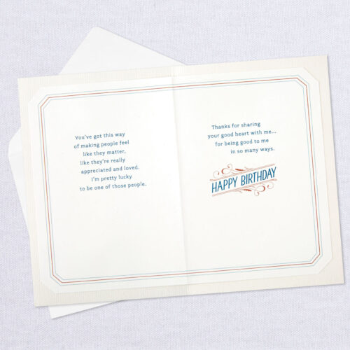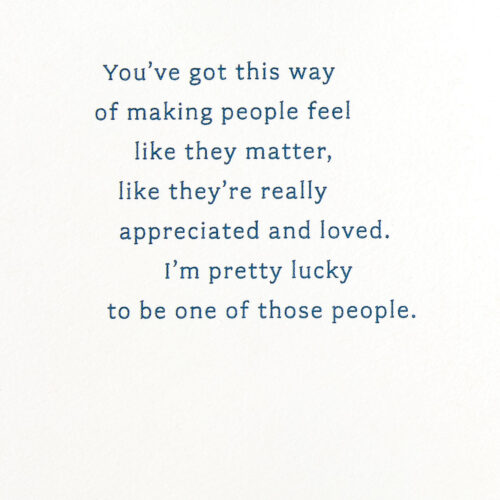 Inside Message: You’ve got this way of making people feel like they matter, like they’re really appreciated and loved. I’m pretty lucky to be one of those people. Thanks for sharing your good heart with me… for being good to me in so many ways. Happy Birthday