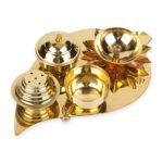 Pooja Thali | Leaf-Shape Brass Pooja Thali Set Combo with Agarbatti Holder, Aarti diya, Roli Holder & Akshat Holder for Mandir, Home, Diwali and Special Occasions (Large, Gold)-450g