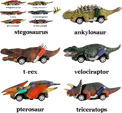 - A collection of 6 artfully-crafted roadster dinosaur pull back toy cars make perfect dino toys for 3 year old boys. Our dinosaur toys include T-Rex, Triceratops, Stegosaurus, Ankylosaur, Pterosaur, and Velociraptor.