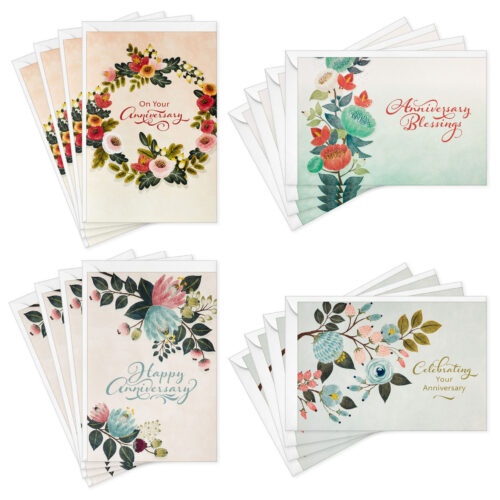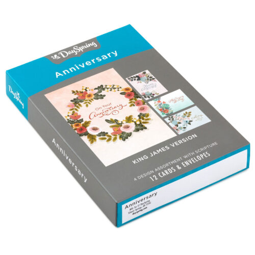 Boxed religious anniversary greeting card assortment includes 12 cards/envelopes: 3 each of 4 designs. Each card features a floral design with a Christian message and Bible verse scripture inside.