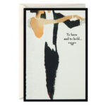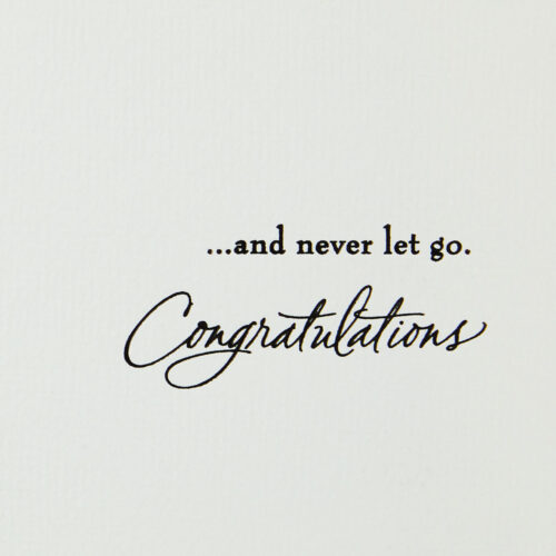 Wedding greeting card features a watercolor painting of a couple dancing their first dance as bride and groom. Embossing and glitter accents add sparkle to the design.
