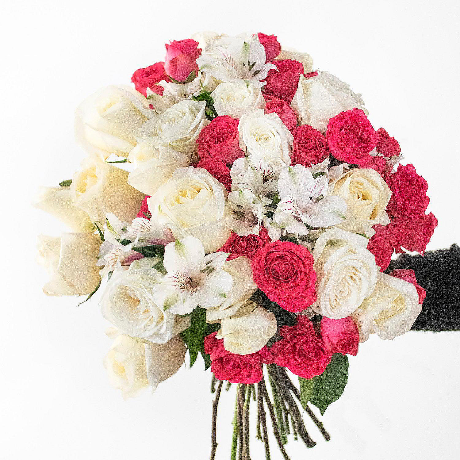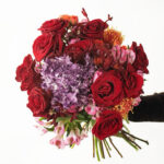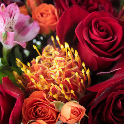 This bouquet has a mix of 34 stems of Black Magic Red Rose, Purple Hydrangea, Orange Pincushion, Hot Pink Alstroemeria, Orange Spray Roses, and Red Kangaroo Paw.