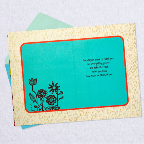 Thank-you greeting from group shares your appreciation with bright retro flower illustrations, foil highlights and gemstone embellishments. Greeting also features embossing and a die-cut attachment.