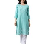 Women Turquoise Blue & White Embroidered Kurta with Trousers-SMALL(Turquoise Blue)