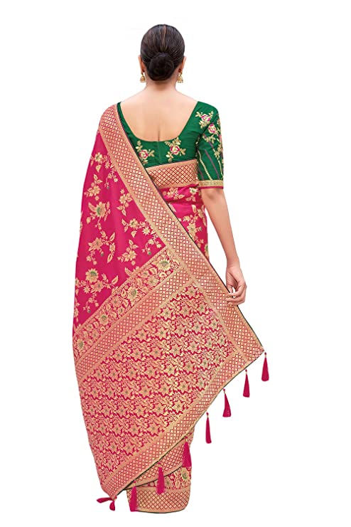 Women’s Banarasi Silk Blend Zari Woven Work With Tussles Saree and Unstitched Heavy Embroidered Work Blouse Piece Free size- Magenta