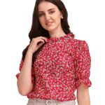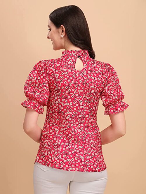 Women’s Casual Puff Sleeves Ruffled Collor Foral Top-S-Dark Pink