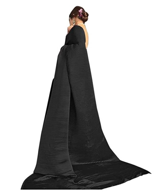 Women’s Full Crushed/Pleated Satin Saree With Unstitched Blouse Piece-Black