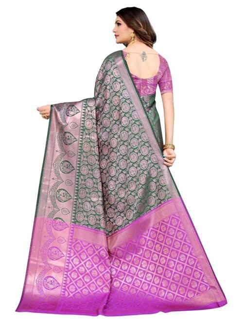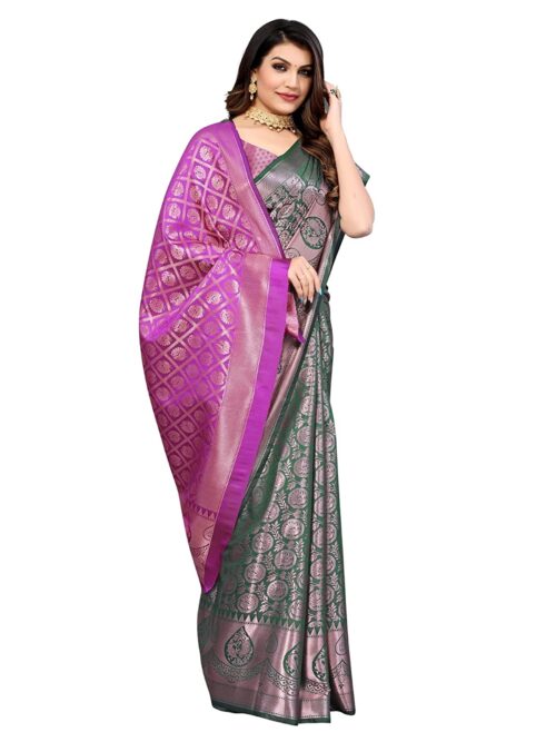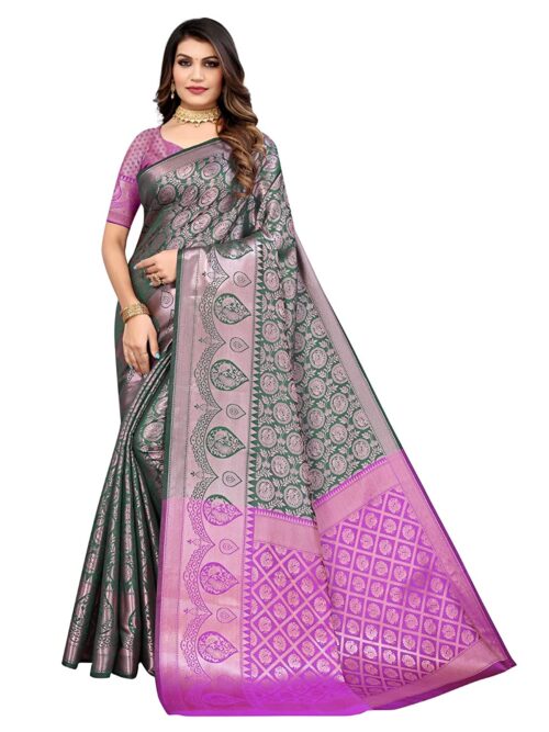 Women’s Kanchipuram Silk Sarees With Un-stitched Blouse Piece (lichi peacock paithani)-Green