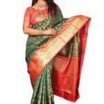 Women’s Kanjivaram Pure Soft Silk Handloom Saree Pure Golden Zari With Blouse Piece- Dark Green