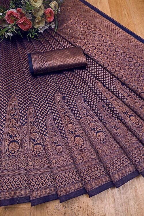Women’s Kanjivaram Soft Pure Lichi Silk Saree With Blouse Piece-Navy Blue