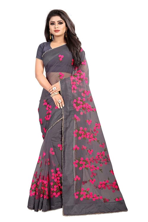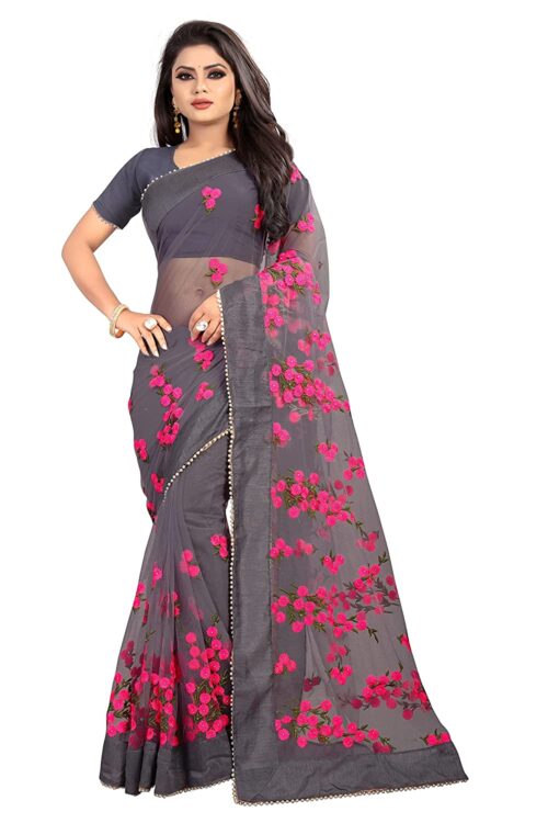 Women’s Net Embroidered And Pearl Work Saree-GREY