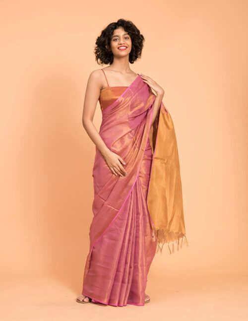 - Saree details- Saree Color: Pink | Material: Linen | Length: 5.5 m | Print: Solid | Work Type: Solid