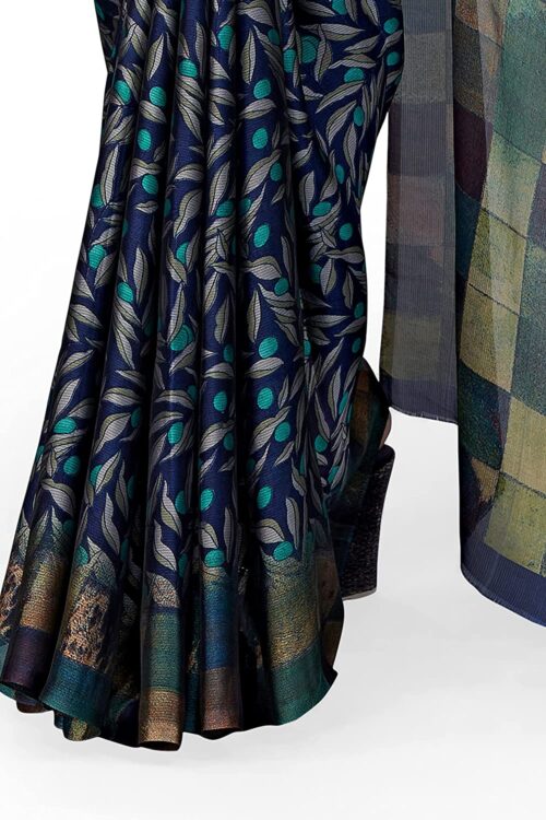 Women’s Plain Weave Chiffon Leaf Printed Saree with Blouse Piece (37478-Navy Blue, Turquoise)