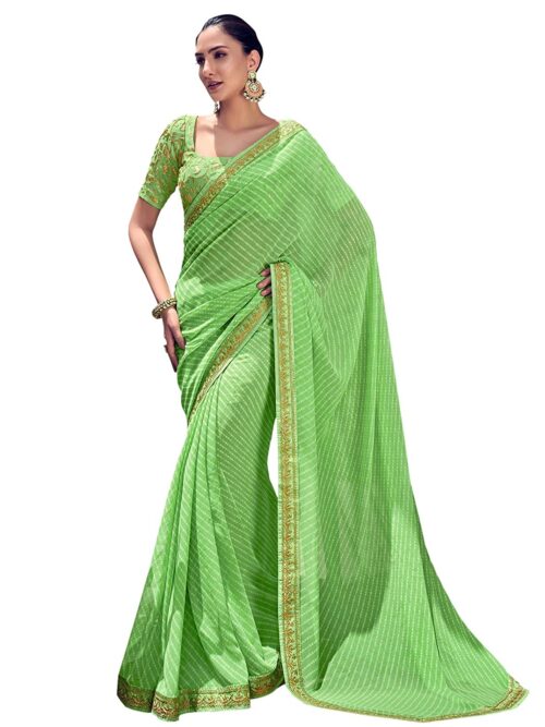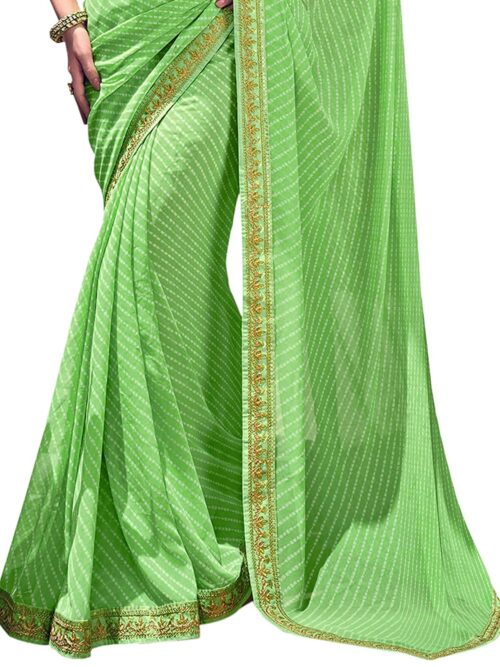 Women’s Printed Leheriya & Lace Georgette Saree with Unstitched Blouse Piece-Light Green, White