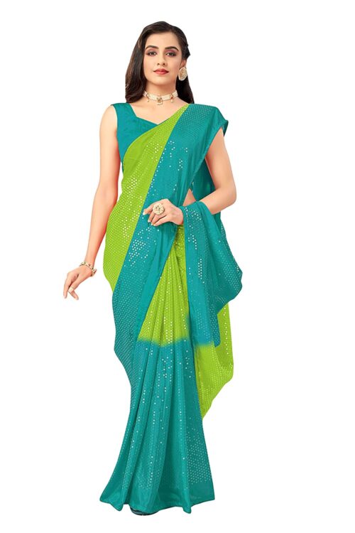 Women’s Pure Chiffon All over Heavy White Sequance Work Women’s 5.5 Meter Exclusive Saree with Regular 0.8 Meter Blouse Piece-Green
