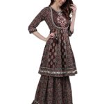Women’s Pure Cotton Brown Zari Embroidered Peplum Kurta Sharara Dupatta Set-LARGE