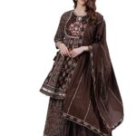 Women’s Pure Cotton Brown Zari Embroidered Peplum Kurta Sharara Dupatta Set-SMALL