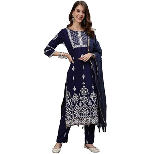 Women’s Rayon Floral Embroidered Regular Kurta Trousers with Dupatta NAVY BLUE L
