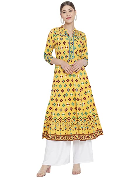 Women’s Rayon Patola Printed Anarkali Kurti (Yellow) size L