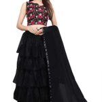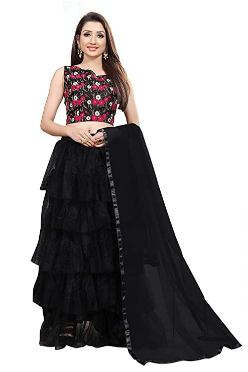 Women’s Ruffle Net Embroidered Semi-Stitched Lehenga Choli-Black