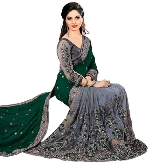 Women’s Satin Net Embroidery Mirror Work Half half Saree With Blouse Piece- Dark Green