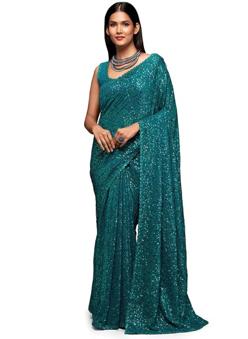 Women’s Sequins Work Heavy Georgette Saree with Blouse (Teal Blue)