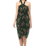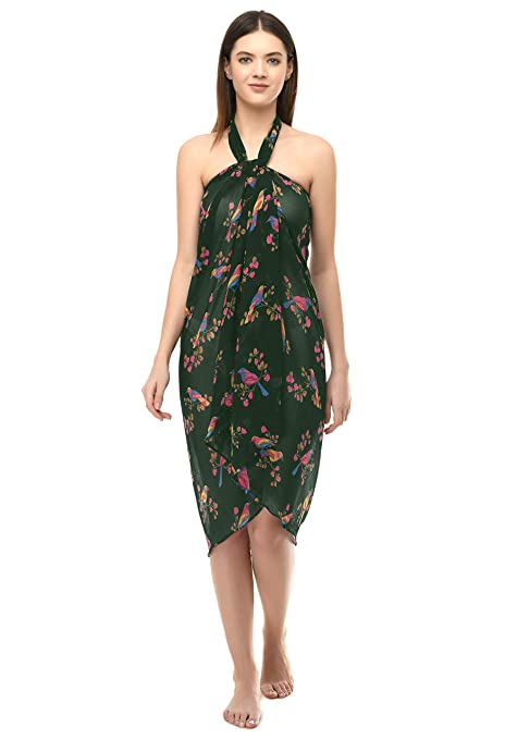 Women’s Stylish Beachwear Wrap Sarong Bird Printed Pareo Swimsuit Body Coverup Dress-Dark Green, Pink