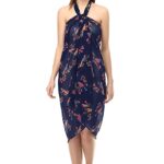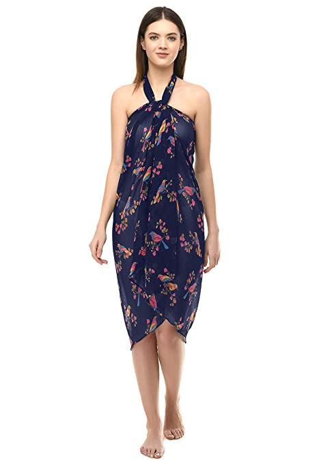 Women’s Stylish Beachwear Wrap Sarong Bird Printed Pareo Swimsuit Body Coverup Dress-Navy Blue, Pink
