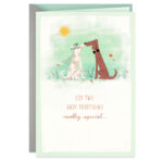 Wedding greeting card celebrates the love the newlywed couple share with its sweet display of two dogs touching noses. One pup wears a bow tie while the other wears a veil. Foil and metallic ink accents add a festive touch.