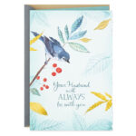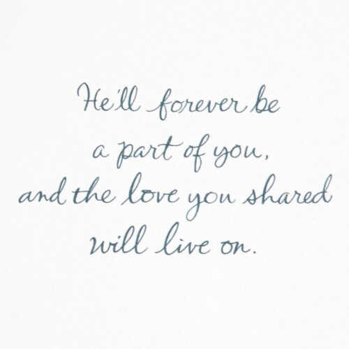 Sympathy greeting card for loss of husband features a watercolor painting of a blue bird on a branch with embossed details and gold metallic ink paired with a sincere reminder that their love will live on.